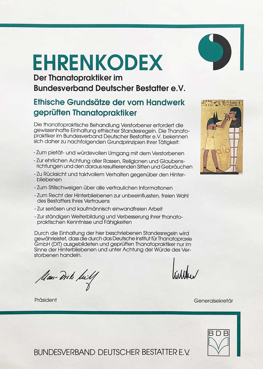 2005 absolvierte ich meine Ausbildung zum geprüften Bestatter am Bundesausbildungszentrum der Bestatter in Münnerstadt.