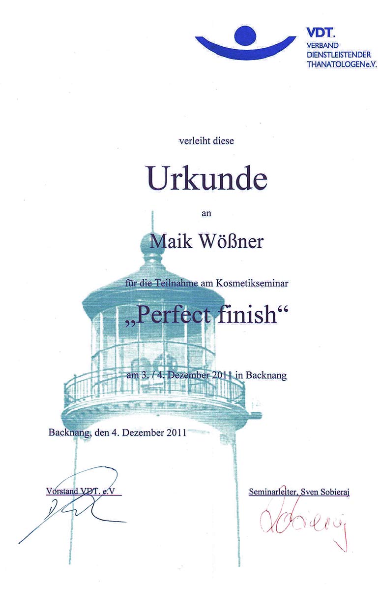 2006 zertifizierte ich mich zum Thanatopraktiker mit Auslandspraktika in Paris.